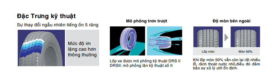Với tính năng vượt trội về độ bền cao, tăng khả năng ổn định, tiếng ồn thấp và thoải mái lái xe trên đường trơn. Hợp chất lốp là sự kết hợp 2 loại gồm polymer đặt biệt giúp kéo dài tuổi thọ lốp xe.