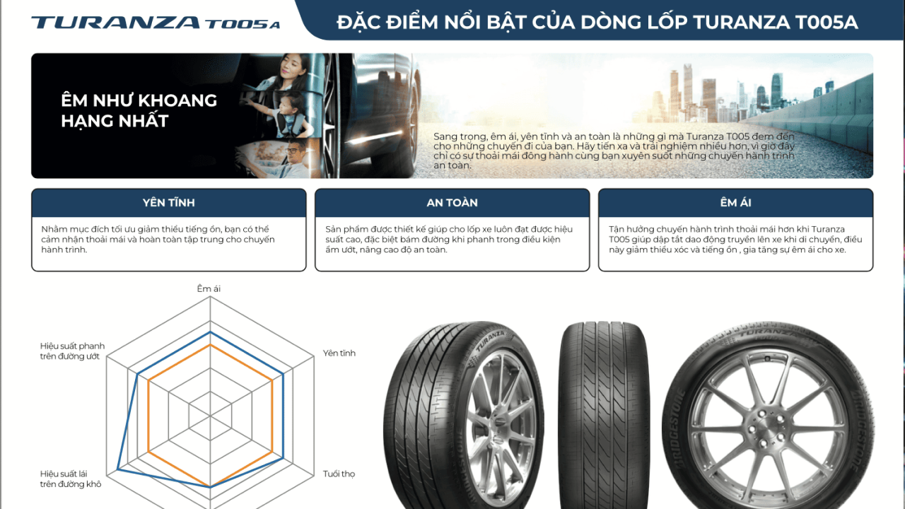 Turanza T005A mang lại cảm giác lái ổn định, thoải mái và an toàn – lý tưởng cho khách hàng thường xuyên di chuyển trong thành phố hoặc hành trình đường dài.
