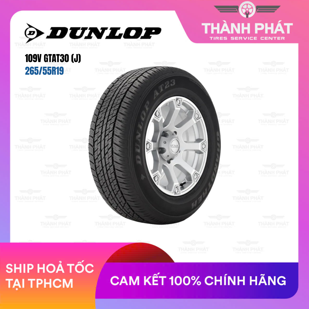 Lốp Dunlop Grandtrek AT30 265/55R19 109V phù hợp cho SUV và bán tải hạng sang sử dụng mâm 19 inch, yêu cầu hiệu suất cao, êm ái và khả năng bám địa hình.