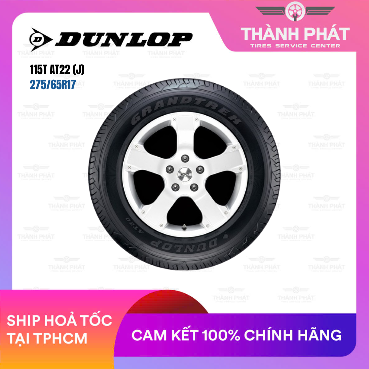 Lốp Dunlop Grandtrek AT22 275/65R17 115T – dòng lốp đa địa hình (All-Terrain) cao cấp dành cho SUV và bán tải cỡ lớn, mang lại hiệu suất ổn định, bền bỉ và êm ái vượt trội.