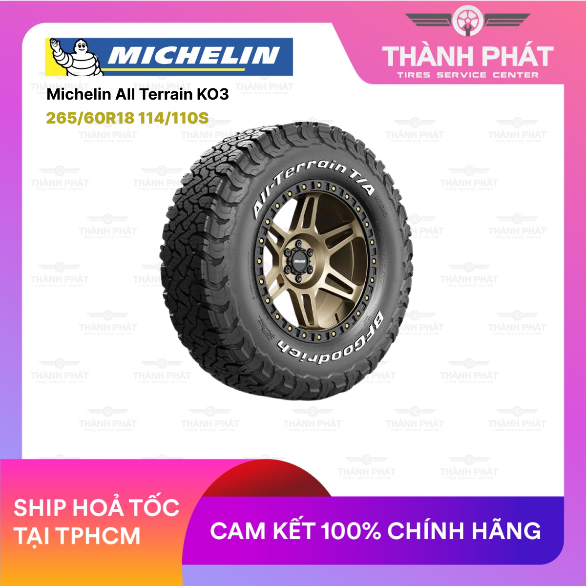 Lốp xe BF Goodrich 265/60R18 All Terrain KO3 – dòng lốp đa địa hình cao cấp kết hợp giữa sức mạnh off-road và sự êm ái trên đường nhựa. Sở hữu gai lốp khỏe khoắn, khả năng bám đường ấn tượng và độ bền vượt trội, đây là lựa chọn hoàn hảo cho những ai yêu thích khám phá và di chuyển đa dạng địa hình. Phù hợp cho các dòng xe như Toyota Fortuner, Ford Everest, Nissan Terra, Isuzu MU-X.